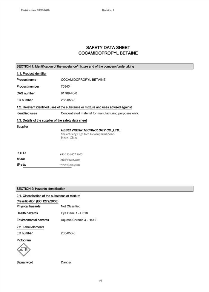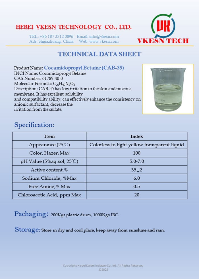 Cocamidopropyl betaine (CAB) is used in many personal care and household products as a surfactant, foam enhancer, and thickening agent.Skin care: As a medium-strength surfactant in bath and body products, removing oil from the skin. It is used as a foam enhancer in body washes and as an emulsifying agent in cosmetics Hair care: It eliminates oil from hair. Cocamidopropyl betaine in shampoos works as a foam booster and creates a rich lather after coming in contact with water. It adds viscosity to hair conditioners and makes them creamier and richer. It also serves as an antistatic agent in hair conditioners